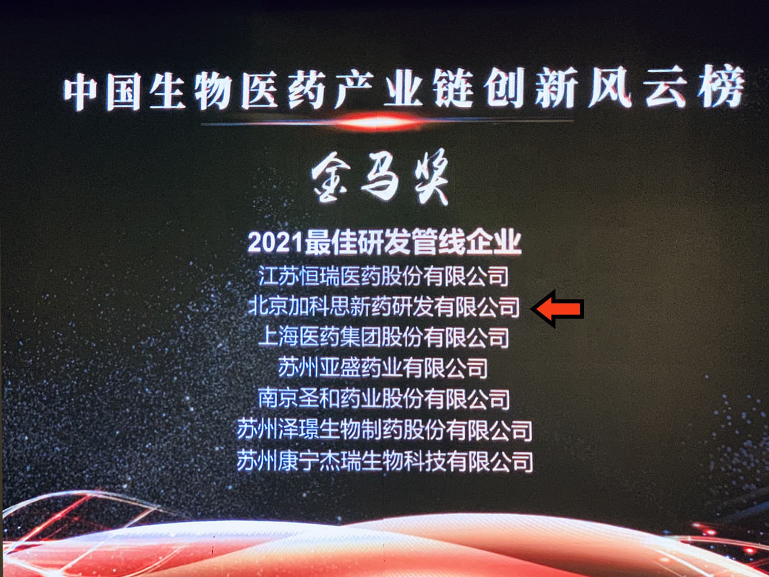 南京国际新药与生命健康产业创新投资峰会于2021年10月19日-21日举行,中国生物医药产业链TOP“创新风云榜”在会议期间发布,加科思药业荣获“2021最佳研发管线企业”,位列第二。